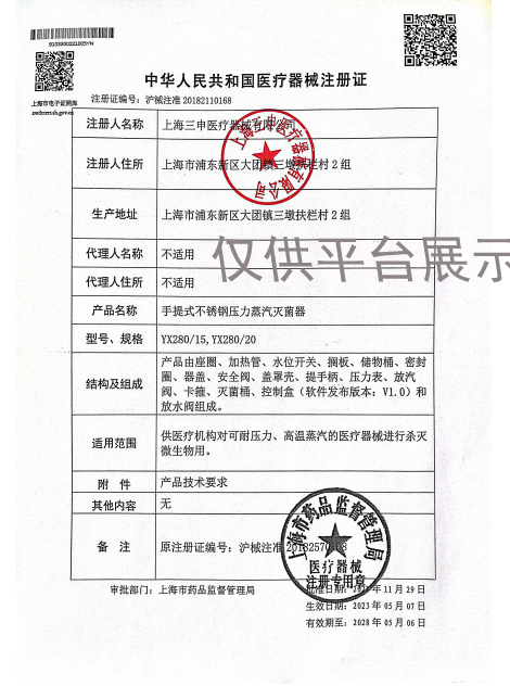 醫(yī)械網(wǎng)是一家提供三申手提式不銹鋼壓力蒸汽滅菌器YX280/20價格、參數(shù)介紹等信息的展示平臺,為您提供優(yōu)質(zhì)的三申手提式不銹鋼壓力蒸汽滅菌器YX280/20產(chǎn)品,上海晚成醫(yī)療器械有限公司專注于各類醫(yī)療器械批發(fā)及零售,聯(lián)系電話:400-006-1850。